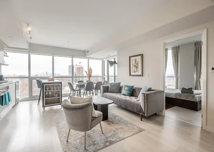 Con instalaciones de autoservicio como una cocina completa, el Panoramic View Condo 2 Bedroom 2 Ba Free Parking también cuenta con una zona de comedor exterior donde los huéspedes pueden relajarse y disfrutar de sus comidas. Se tarda alrededor de 17 minutos en coche para en al Aeropuerto Toronto City Centre desde este alojamiento.